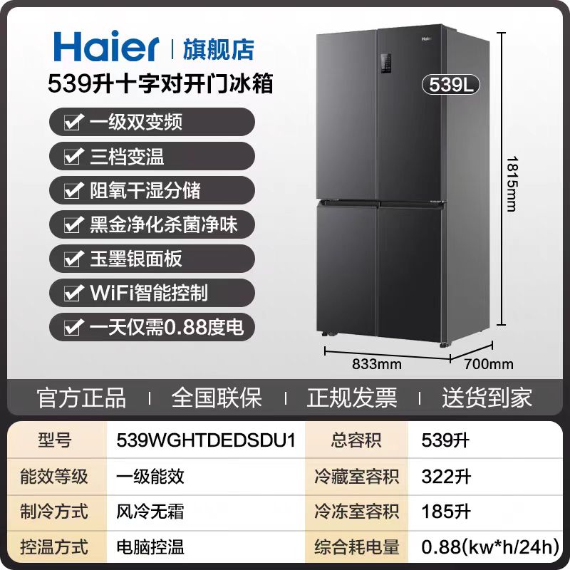 【海尔539L】十字对开门电冰箱 家用无霜变频一级能效双开门大容量